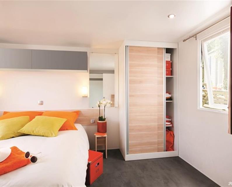 Entdecken Sie unser Premium-Mobilheim Homeflower, eine hochwertige Unterkunft von 35 m², die optimalen Komfort für bis zu sechs Personen bietet. Dieses geräumige Modell, ideal für Familien oder Gruppen, umfasst drei Schlafzimmer: eines mit einem Doppelbett (160 x 200 cm) und zwei mit Einzelbetten (80 x 190 cm). Ausgestattet mit reversibler Klimaanlage, Verdunkelungsrollos in jedem Schlafzimmer für eine erholsame Nachtruhe und Moskitonetzen garantiert es ruhige Nächte.